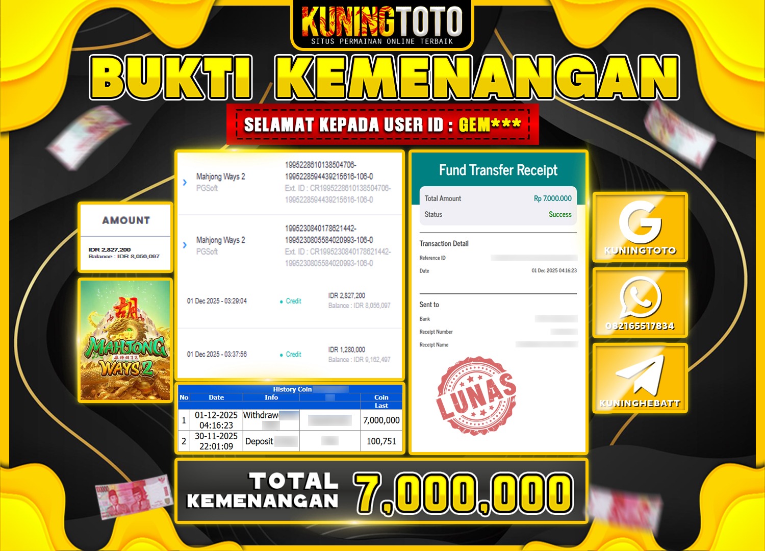 Bukti Kemenangan Slot KuningToto 01 Desember 2025 Slot Mahjong Ways 2