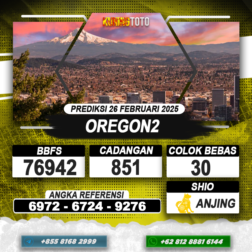 PREDIKSI TOGEL OREGON2 26 FEB 2025 – Selamat Datang di Situs Prediksi Togel Online Akurat dan Resmi KUNINGTOTO. Permainan Togel atau Toto Gelap ini telah lama menarik perhatian dan banyak dimainkan oleh para bettor. Sejak dulu permainan togel dimainkan dengan memasang taruhan angka dengan bandar darat yang tersedia di daerah masing – masing. Namun sekarang ini dengan perkembangan teknologi yang semakin maju, para bettor bisa menikmati permainan togel secara online. Anda bisa menemukan banyak6ya Situs Bandar Togel Online yang menyediakan layanan pemaangan angka togel secara praktis. Dimana masing – masing situs bandar togel online resmi dan terpercaya tentu menyediakan layanan dan keuntungan yang berbeda – beda untuk Anda.