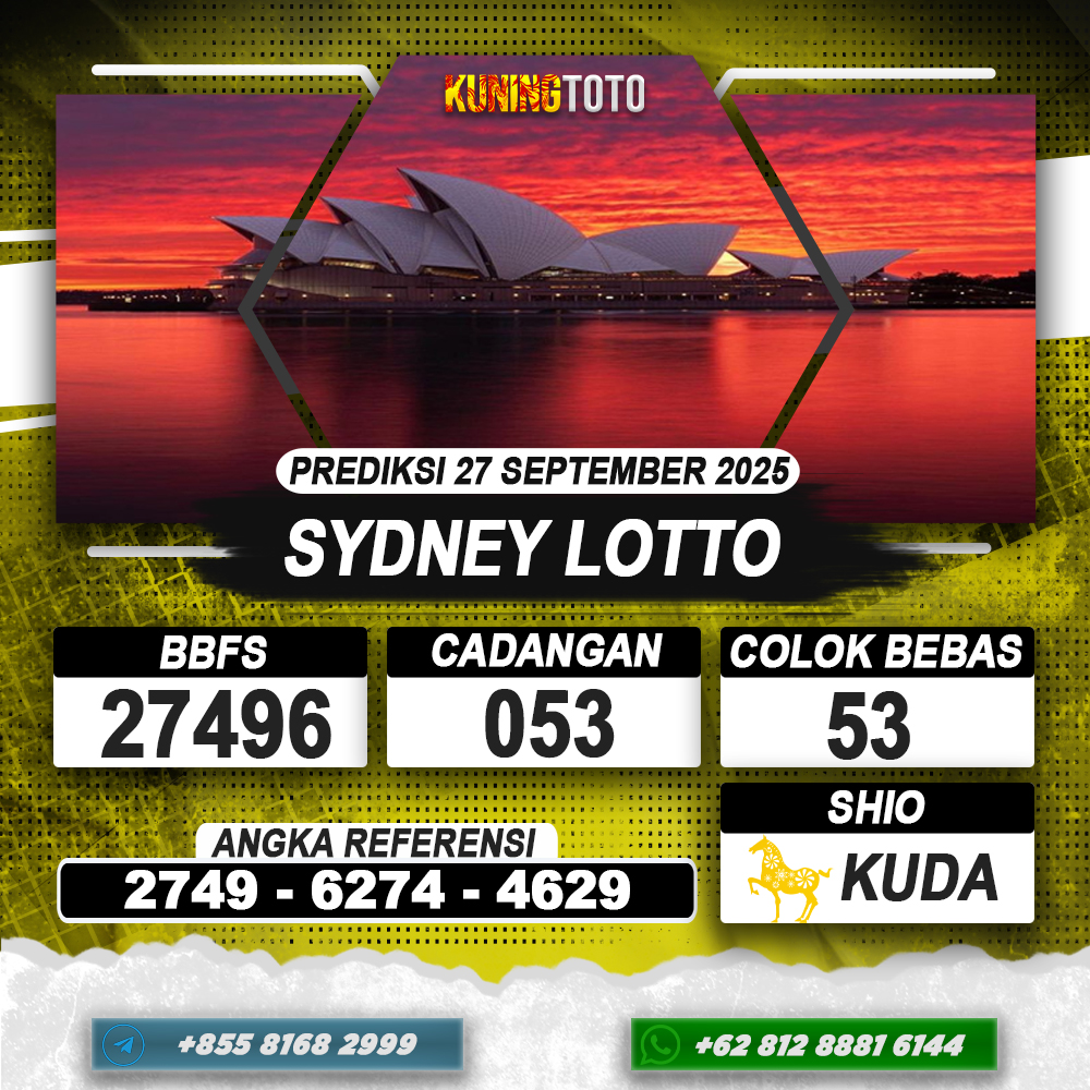 PREDIKSI TOGEL SYDNEY LOTTO 27 SEPTEMBER 2025 – Selamat Datang di Situs Prediksi Togel Online Akurat dan Resmi KUNINGTOTO. Permainan Togel atau Toto Gelap ini telah lama menarik perhatian dan banyak dimainkan oleh para bettor. Sejak dulu permainan togel dimainkan dengan memasang taruhan angka dengan bandar darat yang tersedia di daerah masing – masing. Namun sekarang ini dengan perkembangan teknologi yang semakin maju, para bettor bisa menikmati permainan togel secara online. Anda bisa menemukan banyak6ya Situs Bandar Togel Online yang menyediakan layanan pemaangan angka togel secara praktis. Dimana masing – masing situs bandar togel online resmi dan terpercaya tentu menyediakan layanan dan keuntungan yang berbeda – beda untuk Anda.