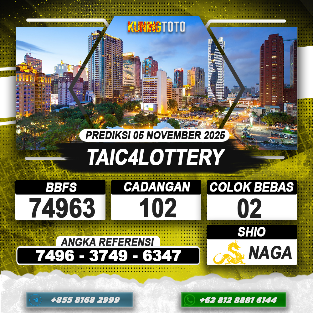 PREDIKSI TOGEL TAIC4LOTTERY 05 NOVEMBER 2025 – Selamat Datang di Situs Prediksi Togel Online Akurat dan Resmi KUNINGTOTO. Permainan Togel atau Toto Gelap ini telah lama menarik perhatian dan banyak dimainkan oleh para bettor. Sejak dulu permainan togel dimainkan dengan memasang taruhan angka dengan bandar darat yang tersedia di daerah masing – masing. Namun sekarang ini dengan perkembangan teknologi yang semakin maju, para bettor bisa menikmati permainan togel secara online. Anda bisa menemukan banyak6ya Situs Bandar Togel Online yang menyediakan layanan pemaangan angka togel secara praktis. Dimana masing – masing situs bandar togel online resmi dan terpercaya tentu menyediakan layanan dan keuntungan yang berbeda – beda untuk Anda.