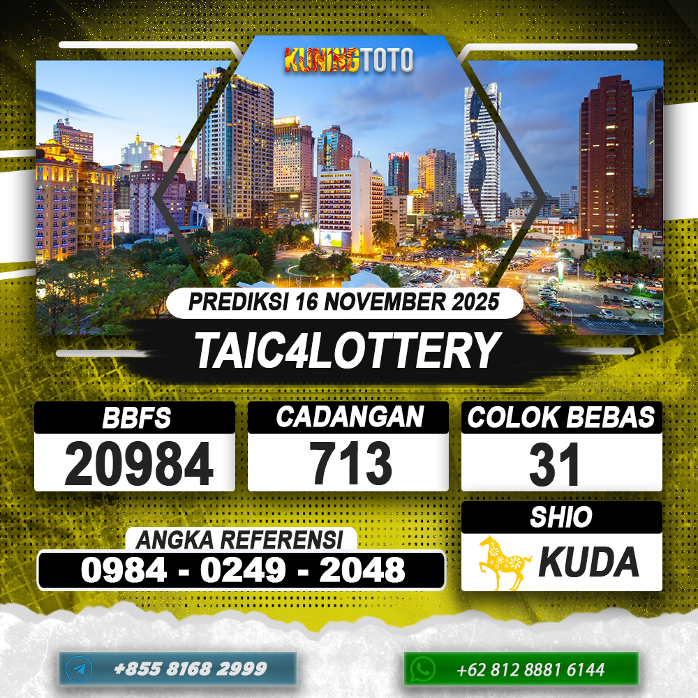 PREDIKSI TOGEL TAIC4LOTTERY 16 NOVEMBER 2025 – Selamat Datang di Situs Prediksi Togel Online Akurat dan Resmi KUNINGTOTO. Permainan Togel atau Toto Gelap ini telah lama menarik perhatian dan banyak dimainkan oleh para bettor. Sejak dulu permainan togel dimainkan dengan memasang taruhan angka dengan bandar darat yang tersedia di daerah masing – masing. Namun sekarang ini dengan perkembangan teknologi yang semakin maju, para bettor bisa menikmati permainan togel secara online. Anda bisa menemukan banyak6ya Situs Bandar Togel Online yang menyediakan layanan pemaangan angka togel secara praktis. Dimana masing – masing situs bandar togel online resmi dan terpercaya tentu menyediakan layanan dan keuntungan yang berbeda – beda untuk Anda.
