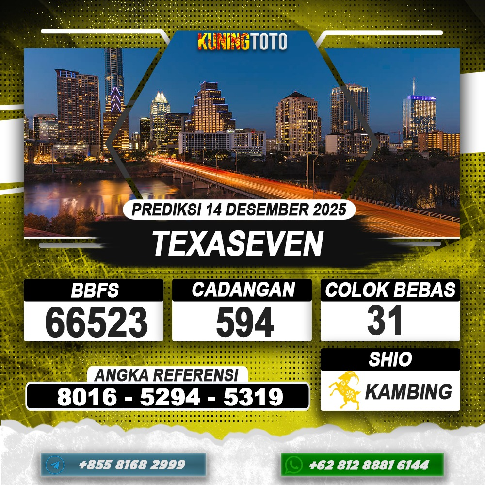 PREDIKSI TOGEL TEXASEVEN 14 DESEMBER 2025 – Selamat Datang di Situs Prediksi Togel Online Akurat dan Resmi KUNINGTOTO. Permainan Togel atau Toto Gelap ini telah lama menarik perhatian dan banyak dimainkan oleh para bettor. Sejak dulu permainan togel dimainkan dengan memasang taruhan angka dengan bandar darat yang tersedia di daerah masing – masing. Namun sekarang ini dengan perkembangan teknologi yang semakin maju, para bettor bisa menikmati permainan togel secara online. Anda bisa menemukan banyak6ya Situs Bandar Togel Online yang menyediakan layanan pemaangan angka togel secara praktis. Dimana masing – masing situs bandar togel online resmi dan terpercaya tentu menyediakan layanan dan keuntungan yang berbeda – beda untuk Anda.