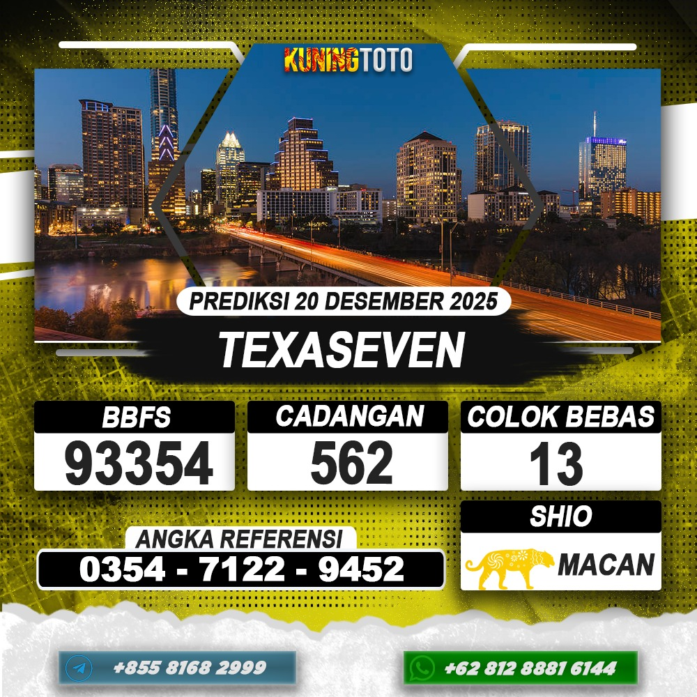 PREDIKSI TOGEL TEXASEVEN 20 DESEMBER 2025 – Selamat Datang di Situs Prediksi Togel Online Akurat dan Resmi KUNINGTOTO. Permainan Togel atau Toto Gelap ini telah lama menarik perhatian dan banyak dimainkan oleh para bettor. Sejak dulu permainan togel dimainkan dengan memasang taruhan angka dengan bandar darat yang tersedia di daerah masing – masing. Namun sekarang ini dengan perkembangan teknologi yang semakin maju, para bettor bisa menikmati permainan togel secara online. Anda bisa menemukan banyak6ya Situs Bandar Togel Online yang menyediakan layanan pemaangan angka togel secara praktis. Dimana masing – masing situs bandar togel online resmi dan terpercaya tentu menyediakan layanan dan keuntungan yang berbeda – beda untuk Anda.